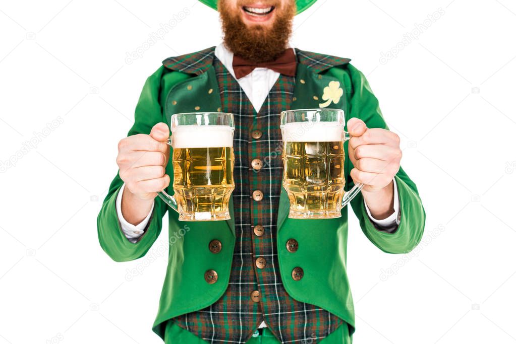обрезанный вид лепрекона, празднующего день святого Патрика с пивом, изолированный на белом