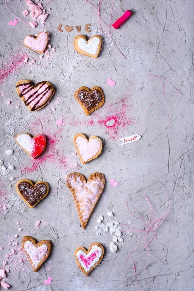 - вид на сладкое печенье в форме сердца ручной работы на День Святого Валентина на серой трещинистой поверхности