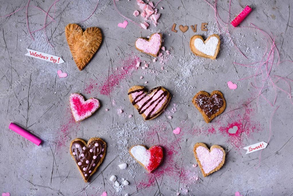 Вид на вкусное печенье в форме сердца на День Святого Валентина на серой трещинистой поверхности
