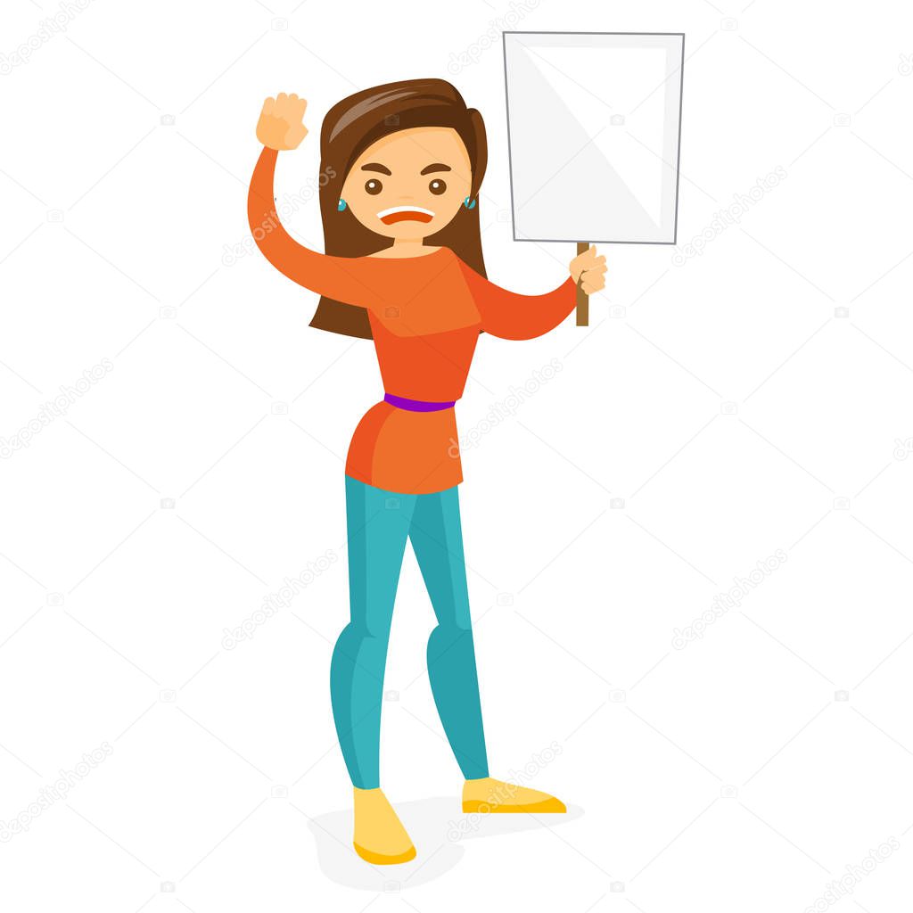 Молодая белая белая кричащая женщина с пустым плакатом на акции протеста феминисток. Концепция феминизма и протеста. Векторная карикатура изолирована на белом фоне. Планировка площади