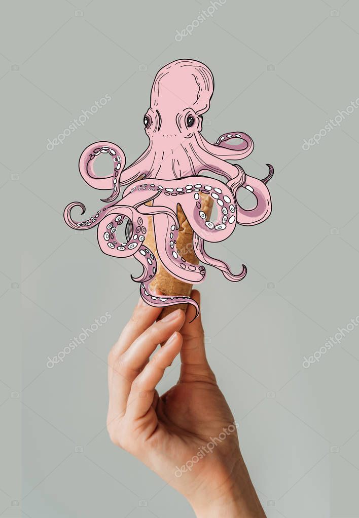 - Обрезанное изображение женщины, держащей вафельный рожок с осьминогом, изолированным на сером