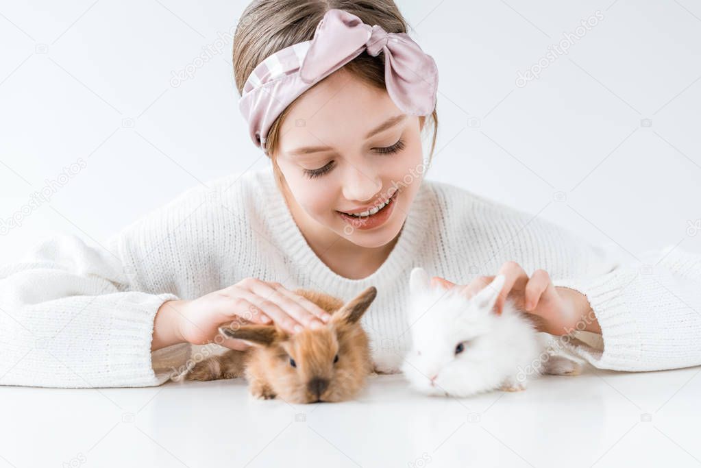 Красивая счастливая девушка играет с очаровательными пушистыми кроликами на белом