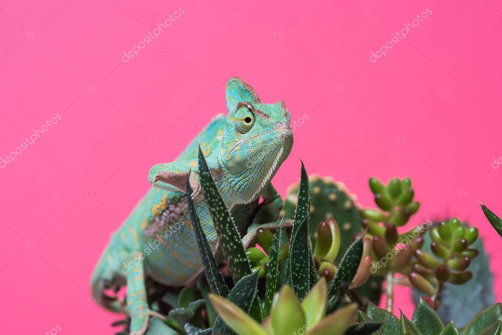 крупным планом вид хамелеона, ползающего на суккулентах, выделенных розовым