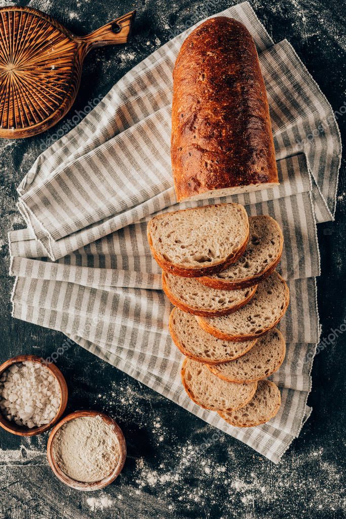 - Плоский лежал с кусочками хлеба на льняном белье и миски с мукой рядом на темной столешнице