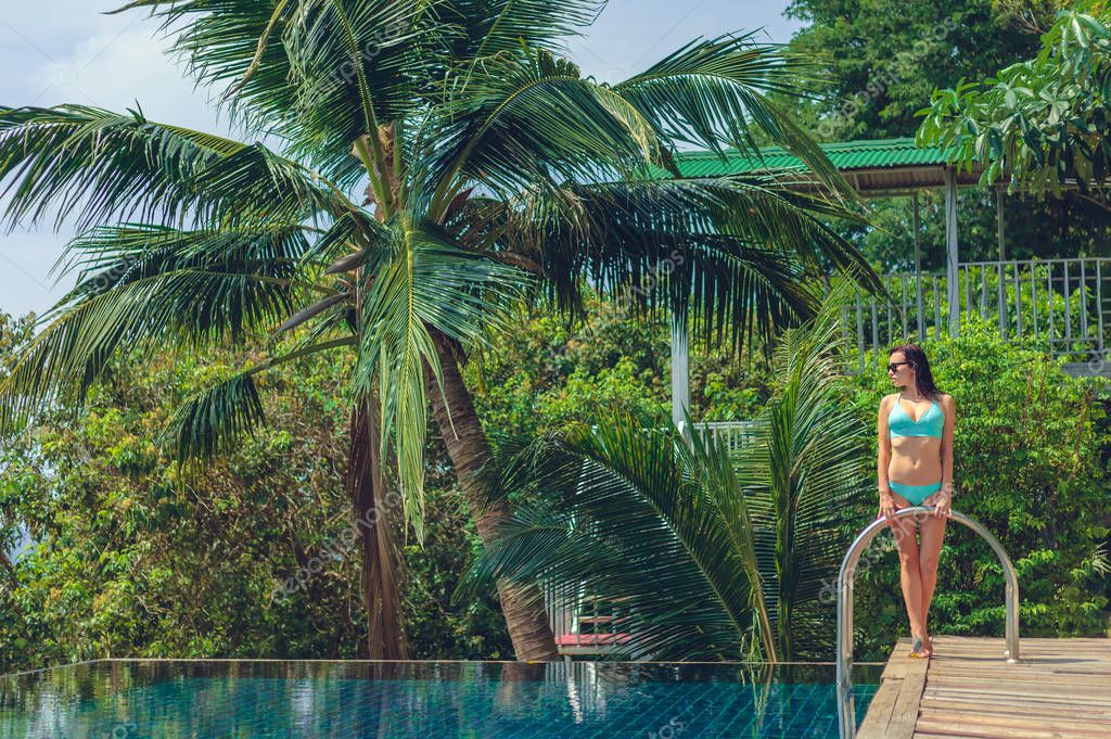 Красивая девушка в бикини стоит возле бассейна и смотрит в сторону