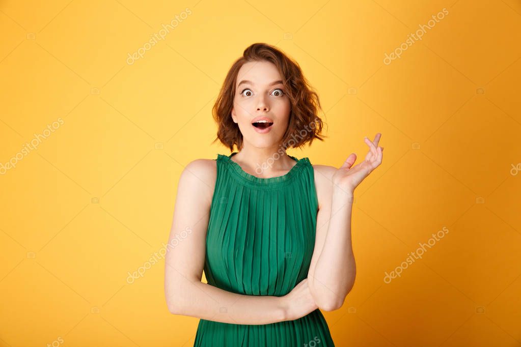 Портрет эмоционально привлекательной женщины, смотрящей на камеру, изолированную от оранжевого