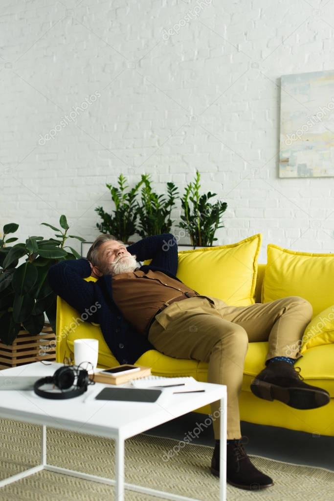 Стильный старший мужчина лежит на диване с руками за головой и глядя вверх