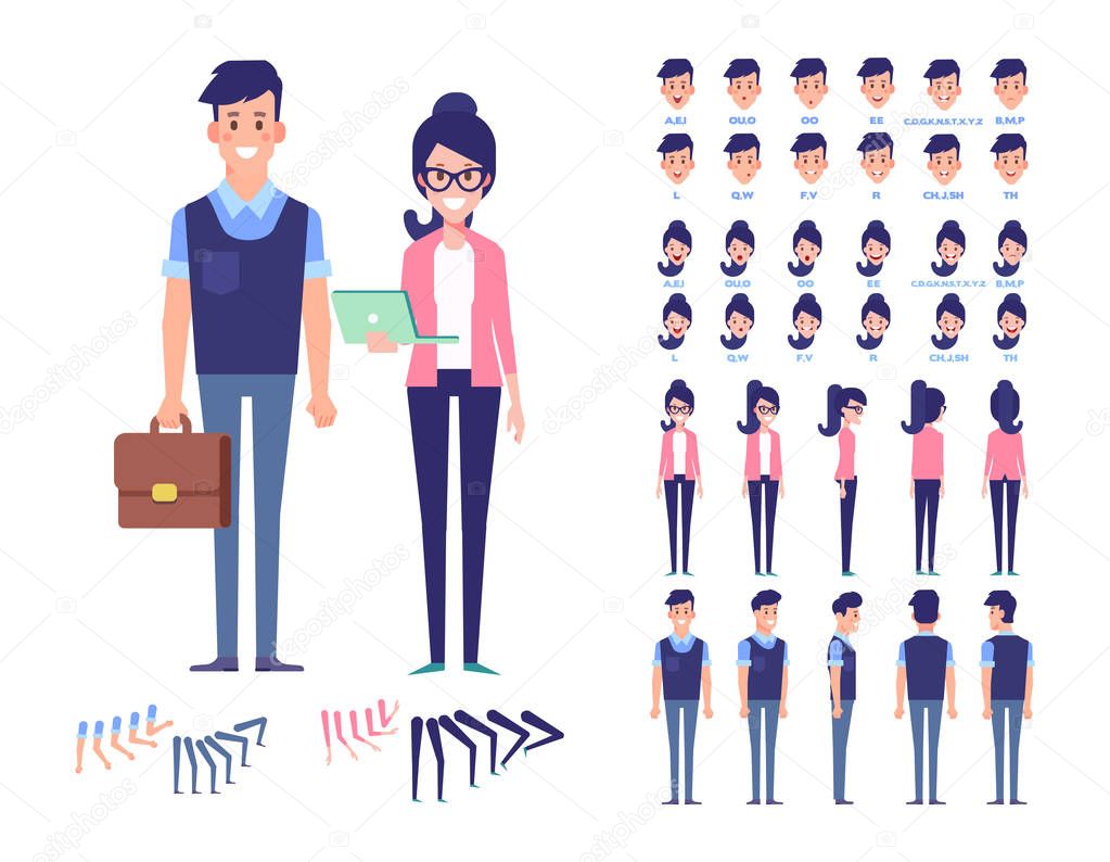 Набор символов Flat Vector для анимации. Деловые люди - мужчина и женщина. Передние, боковые, задние анимационные персонажи .