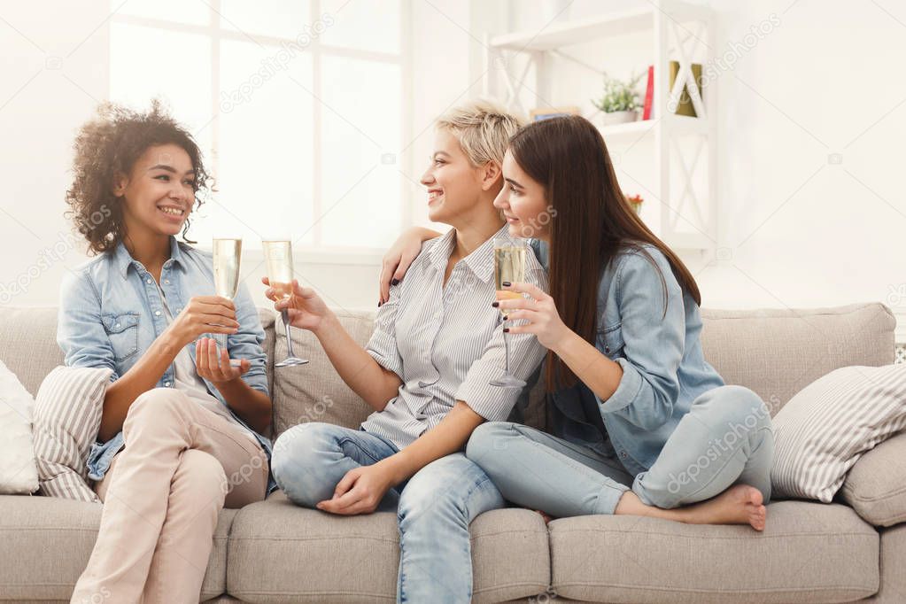 Трое друзей пьют бокалы для шампанского. Молодые счастливые женщины веселятся игристым вином, болтают и празднуют, дремлют, копируют пространство