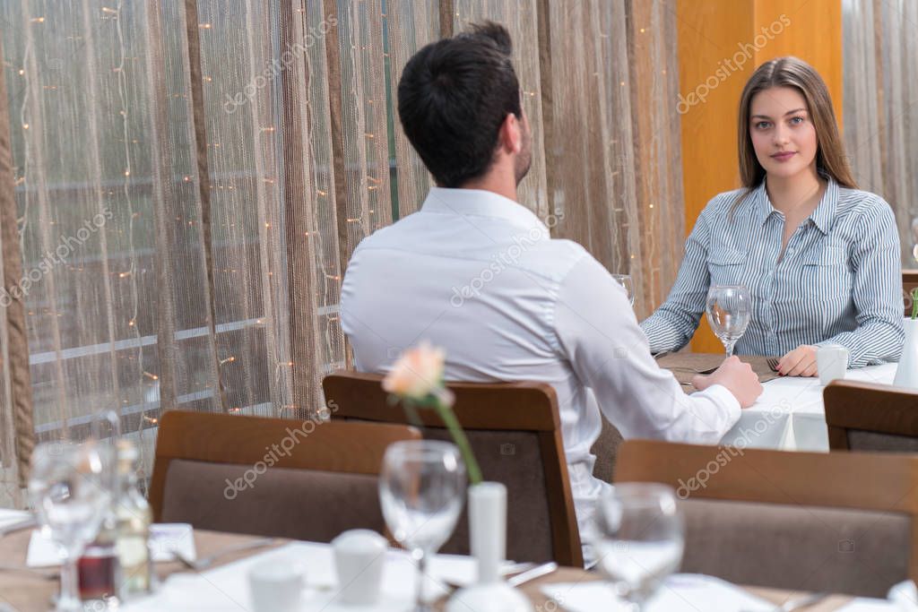 Еда, праздники и люди - улыбающаяся пара ест основное блюдо в ресторане