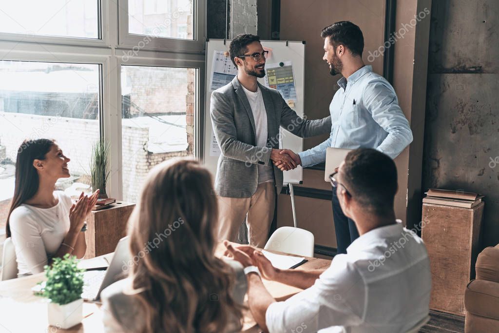 Партнеры пожимают руки в современном офисе
