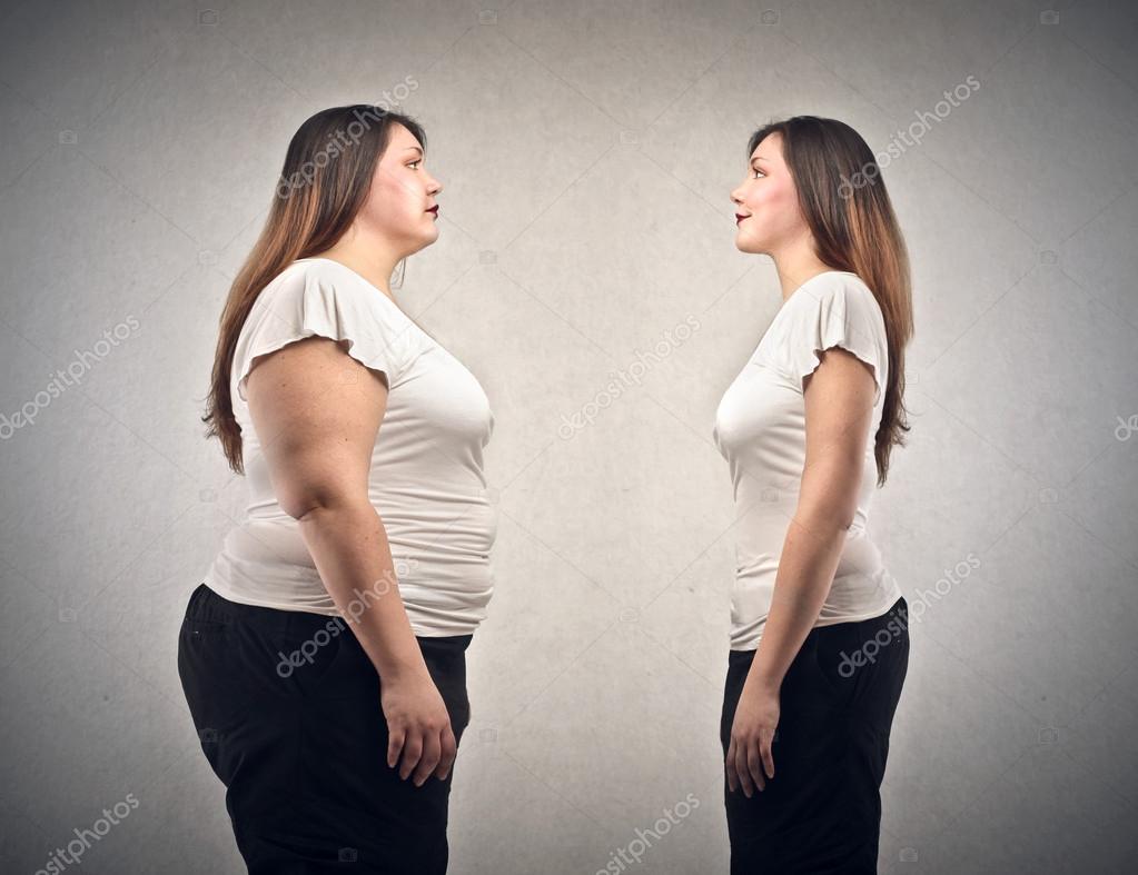 Толстая женщина и стройная женщина на сером backgorund