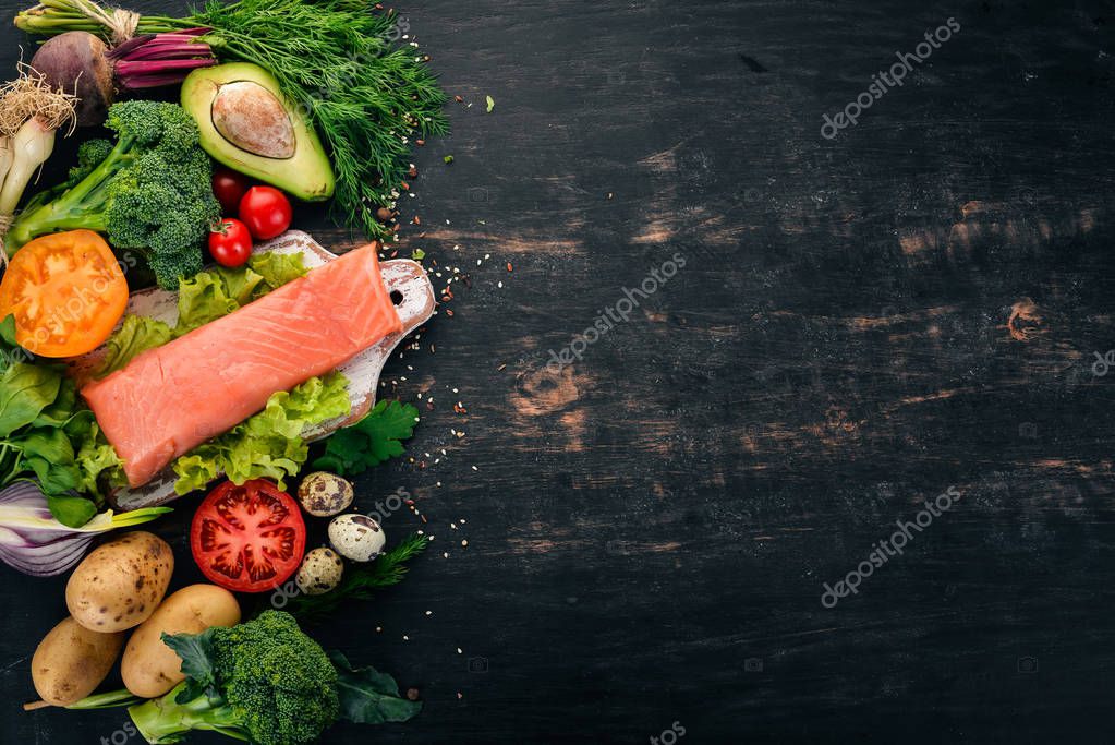 Филе лосося и свежие овощи. Здоровое питание. На черном деревянном фоне. Здоровое питание. Вид сверху. Копирование пространства