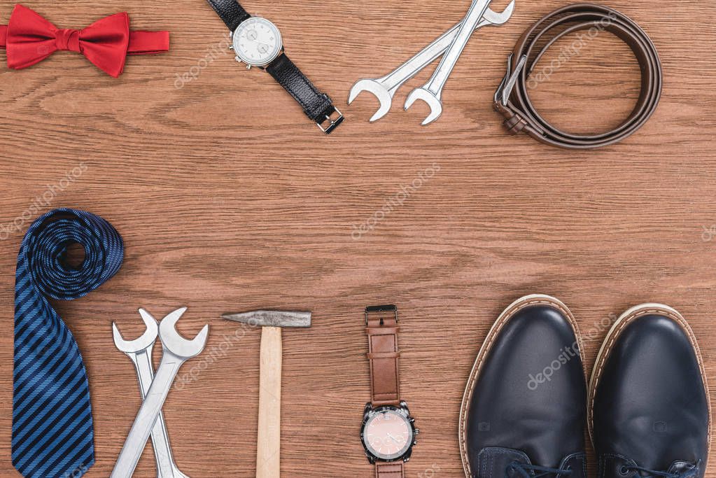 вид сверху на различные мужские атрибуты на деревянной поверхности