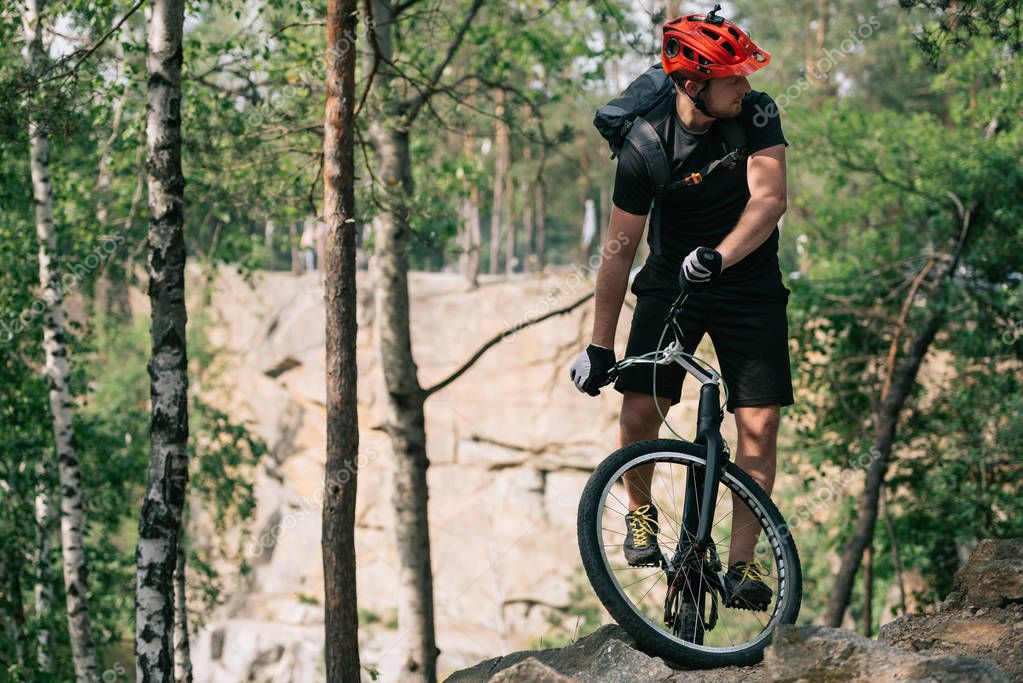 - молодой экстремальный велосипедист в защитном шлеме на горном велосипеде в лесу