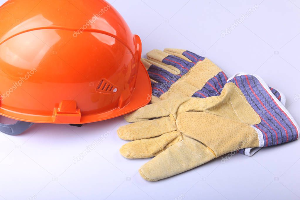 Оранжевая жесткая шляпа, когти и защитные перчатки на белом фоне .