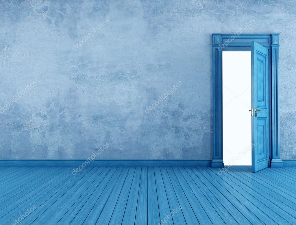 Пустая голубая винтажная комната с открытой старой дверью - рендеринг