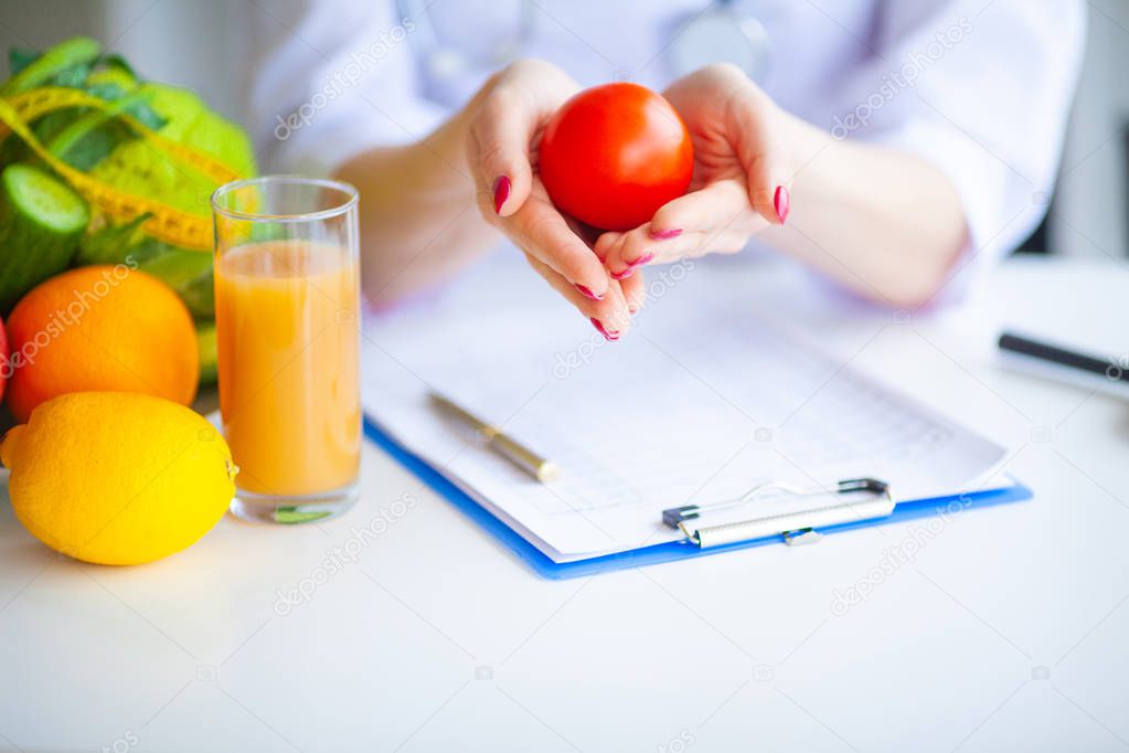 Диета. Доктор Нутриционист держит помидор в своем кабинете. Концепция натурального питания и здорового образа жизни. Концепция здорового питания. Сбалансированное питание с овощами