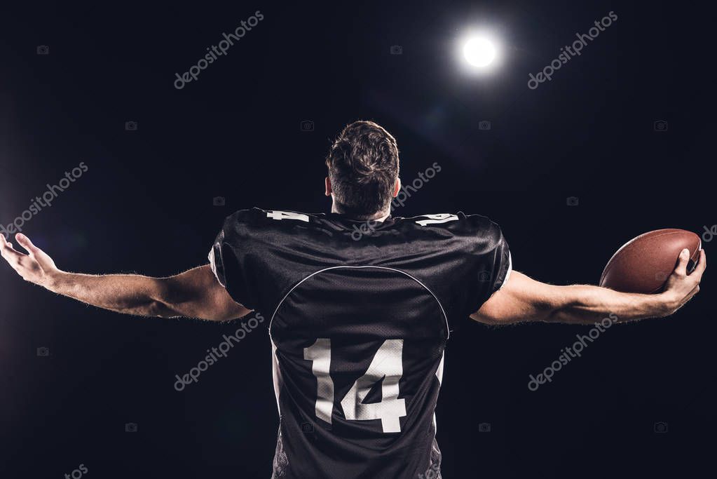 - Задний вид американского футболиста с мячом глядя вверх с протянутыми руками под прожектором на черном