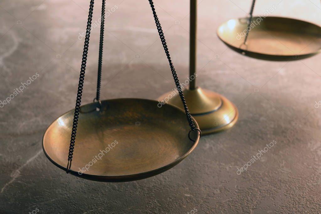 - Весы правосудия на столе, крупным планом. Концепция права