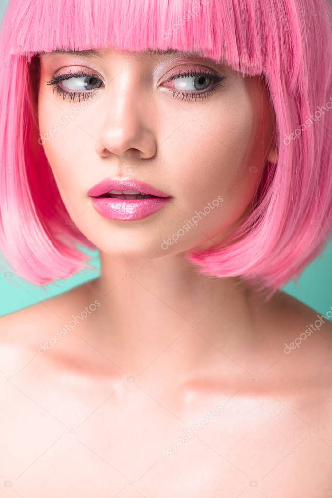 - крупным планом портрет молодой женщины с розовым шиллингом, смотрящей в сторону, изолированную от бирюзы