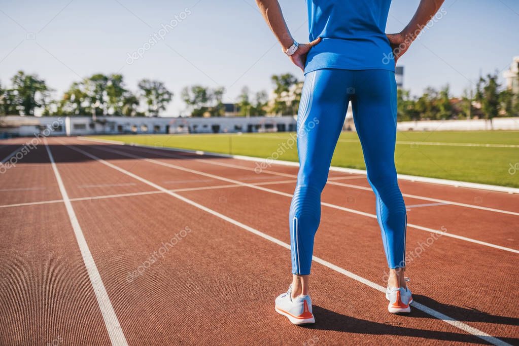 - Крупным планом вырезан вид сзади спортсмена мужского пола, стоящего на беговой дорожке с руками на талии. Бегун, готовящийся бежать на беговой дорожке, был в синей спортивной одежде. Спорт, человек