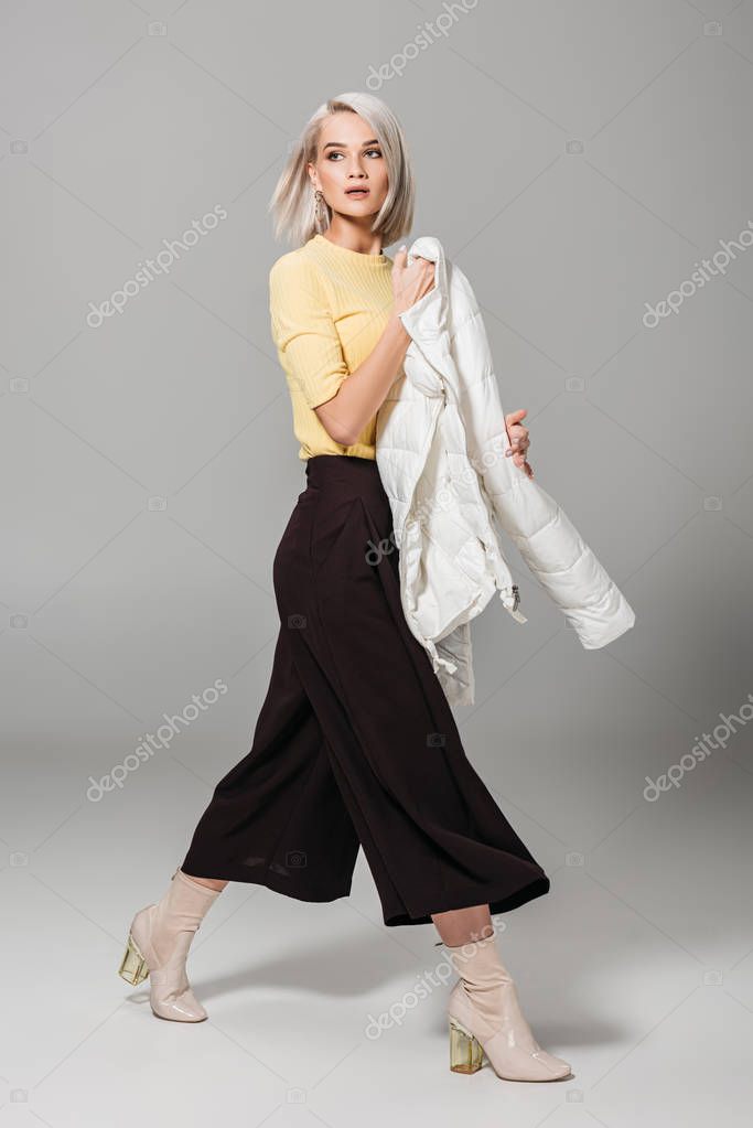 молодая привлекательная модель с белой осенней курткой на сером фоне