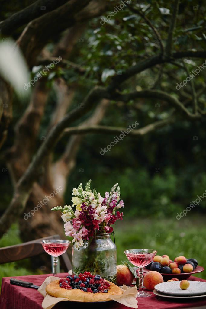 букет цветов в стеклянной банке, пирог и бокалы на столе в саду
