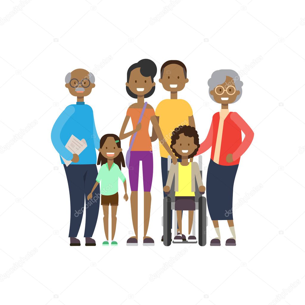 - Африканские бабушки и дедушки и дедушки дети девочка инвалидное кресло, множественное поколение семьи, полная длина аватар на белом фоне, счастливая семья вместе концепция, дерево рода плоский мультфильм