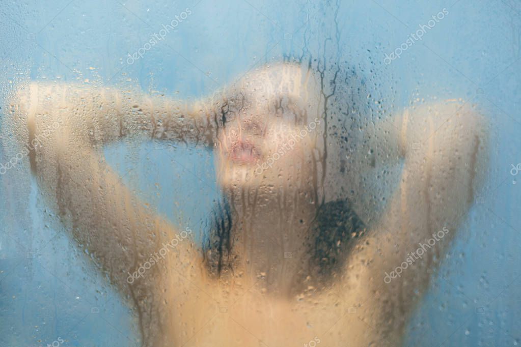 Вид красивой расслабленной женщины с идеальным обнаженным телом, принимает душ, позирует на размытом стеклянном фоне пота, выглядит мечтательно вверх, думает и размышляет о чем-то. Концепция здоровья