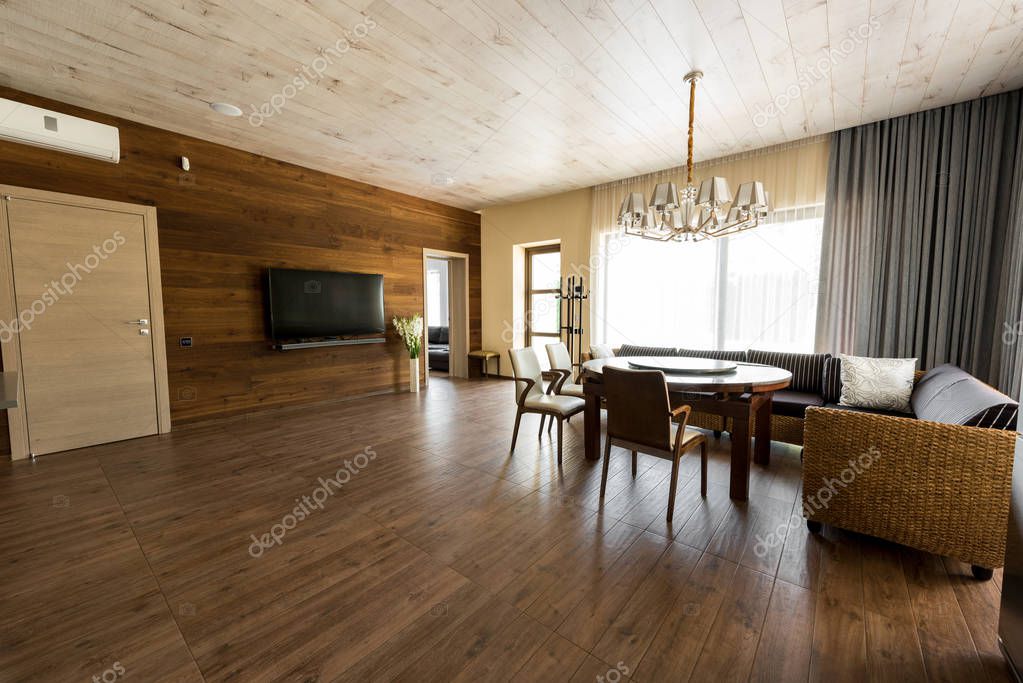 - современный обеденный зал со столом, стульями, диваном и телевизором