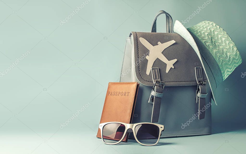 Женский туристический рюкзак хипстера с паспортом и шляпой на синем фоне