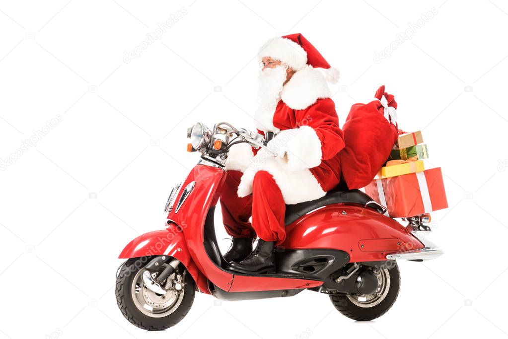 вид сбоку на Санта-Клауса на винтажном красном скутере с мешками и подарочными коробками, изолированными на белом