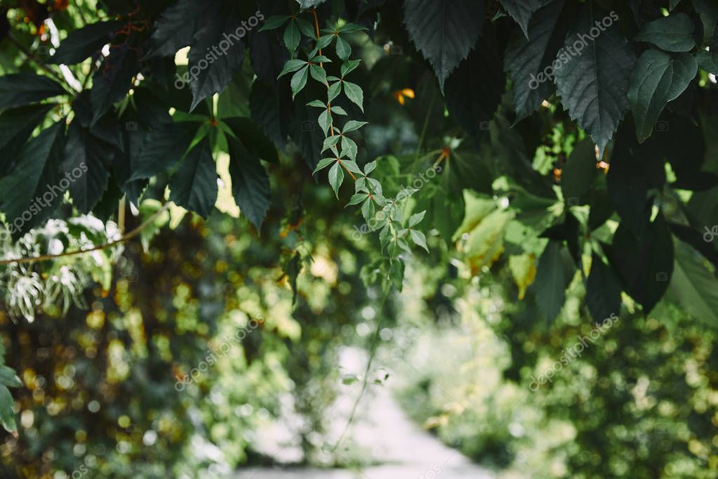 дикие листья виноградной лозы в саду с размытой дорожкой