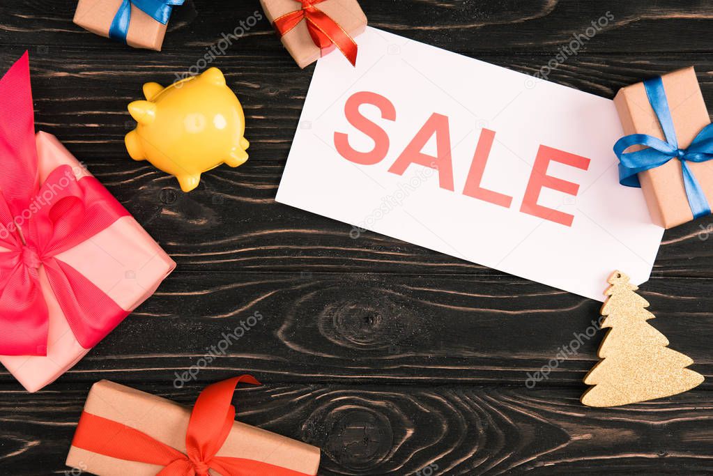 верхний вид на знак продажи, желтая копилка и рождественские подарки на деревянной поверхности