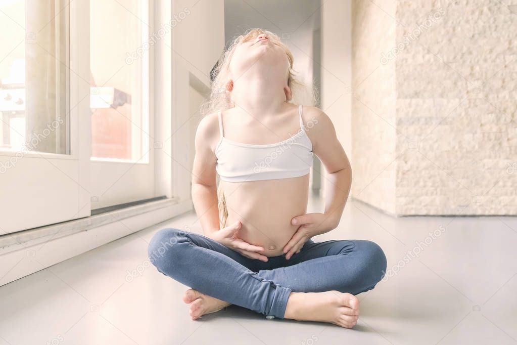 Маленькая блондинка в белом топе и синие леггинсы, занимающаяся йогой в солнечной комнате