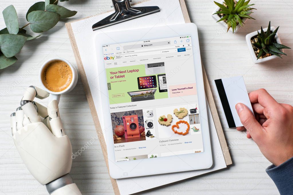 обрезанный образ бизнесмена с киборгом рука держит кредитную карту и с помощью цифровой планшет с Ebay на экране за столом с чашкой кофе в офисе
