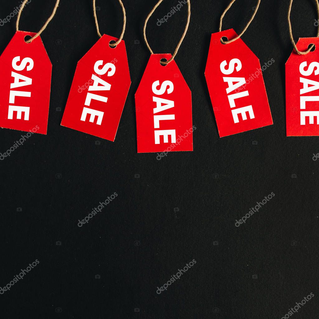 Состав скидок на распродажи "черной пятницы". Красные бирки со словом SALE на чёрном фоне. Заголовок героя. Плоский, вид сверху .
