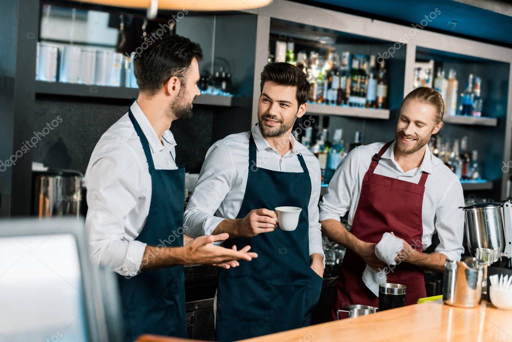 взрослый бармен пьет кофе и разговаривает с коллегами на рабочем месте
