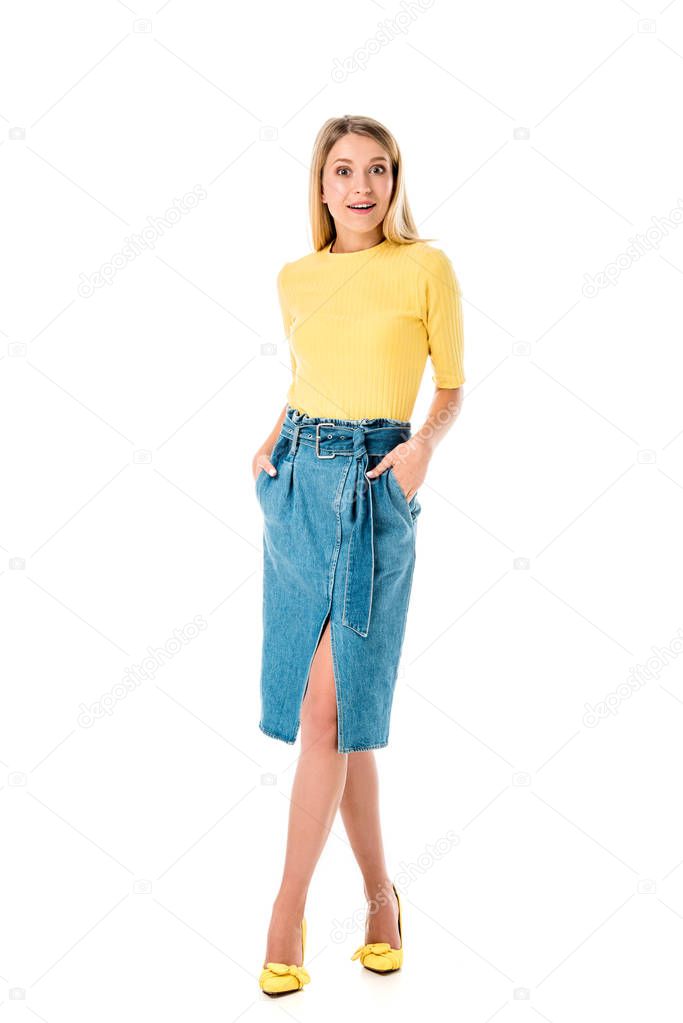 - Вид в полный рост красивой удивленной девушки, смотрящей на камеру изолированную на белом