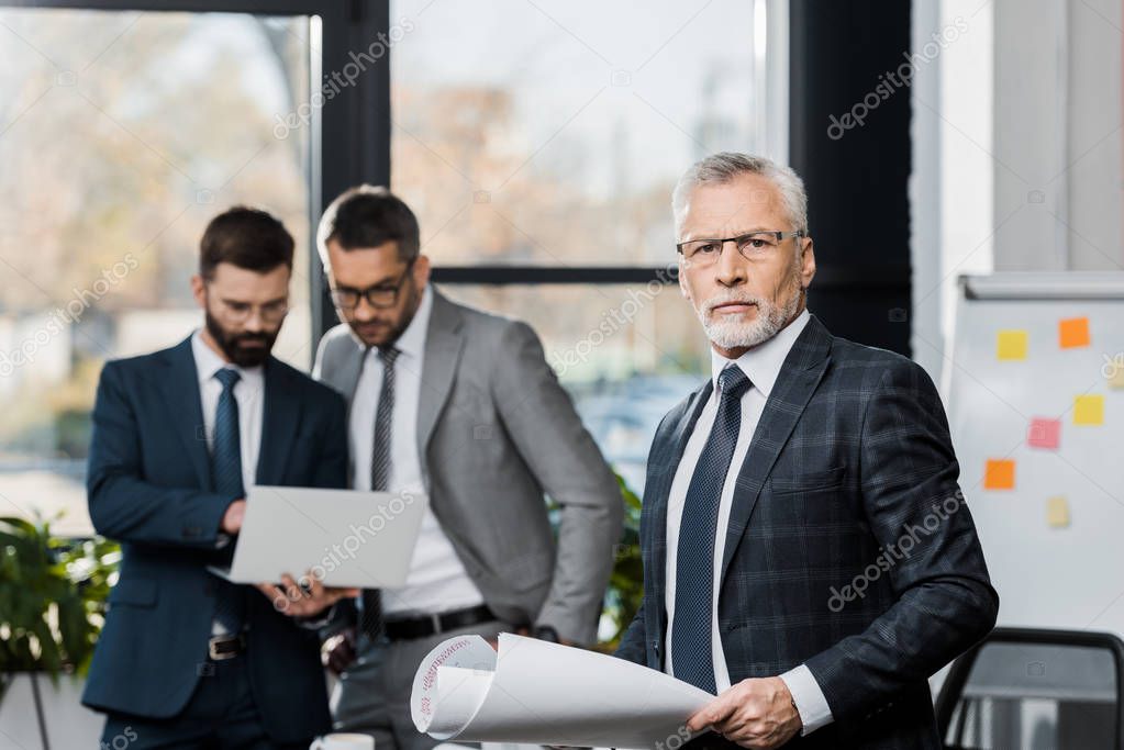 Красивые бизнесмены в костюмах и очках, стоящие с ноутбуками и чертежами в офисе