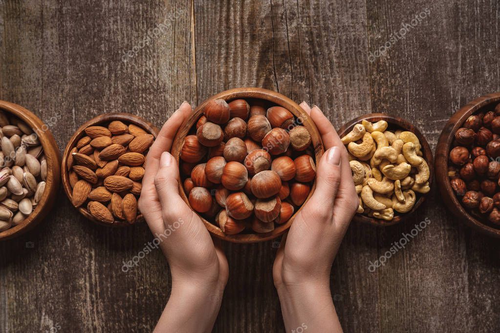 частичный вид женщины, держащей чашу с фундуком на деревянном столе с различными орехами вокруг