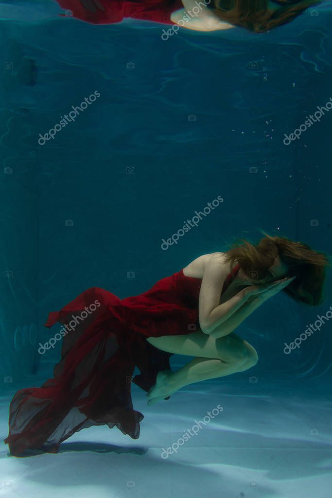 красивая свободная дайвер женщина плавает в длинном красном вечернем платье под водой в одиночку в глубокой