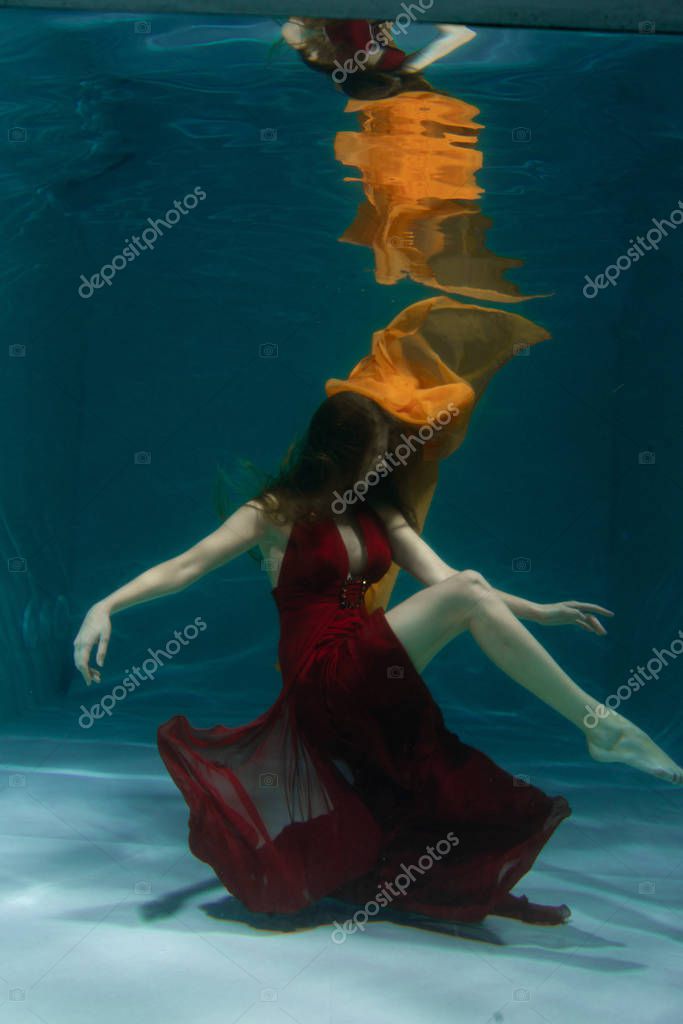 красивая свободная дайвер женщина плавает в длинном красном вечернем платье под водой в одиночку в глубокой