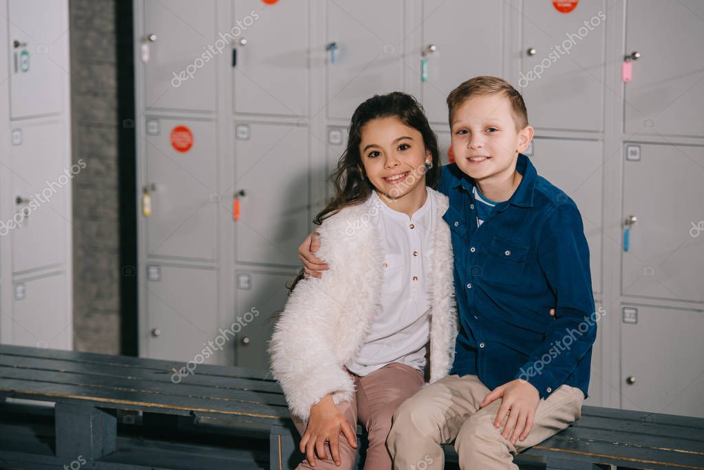 Улыбающийся мальчик обнимает лучшего друга в раздевалке
