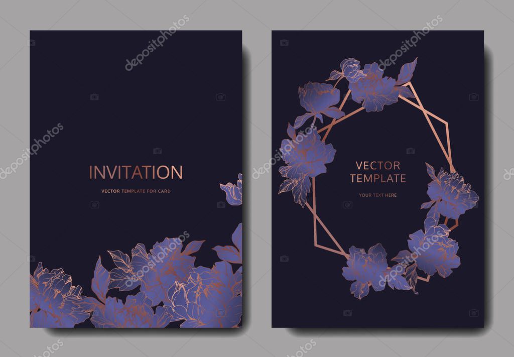 - Векторная свадьба элегантные пригласительные билеты с фиолетовыми пионами на черном фоне .