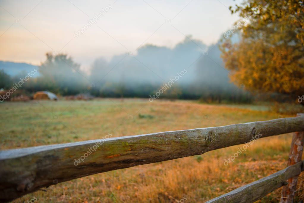 Деревянный забор туманным осенним утром в деревне