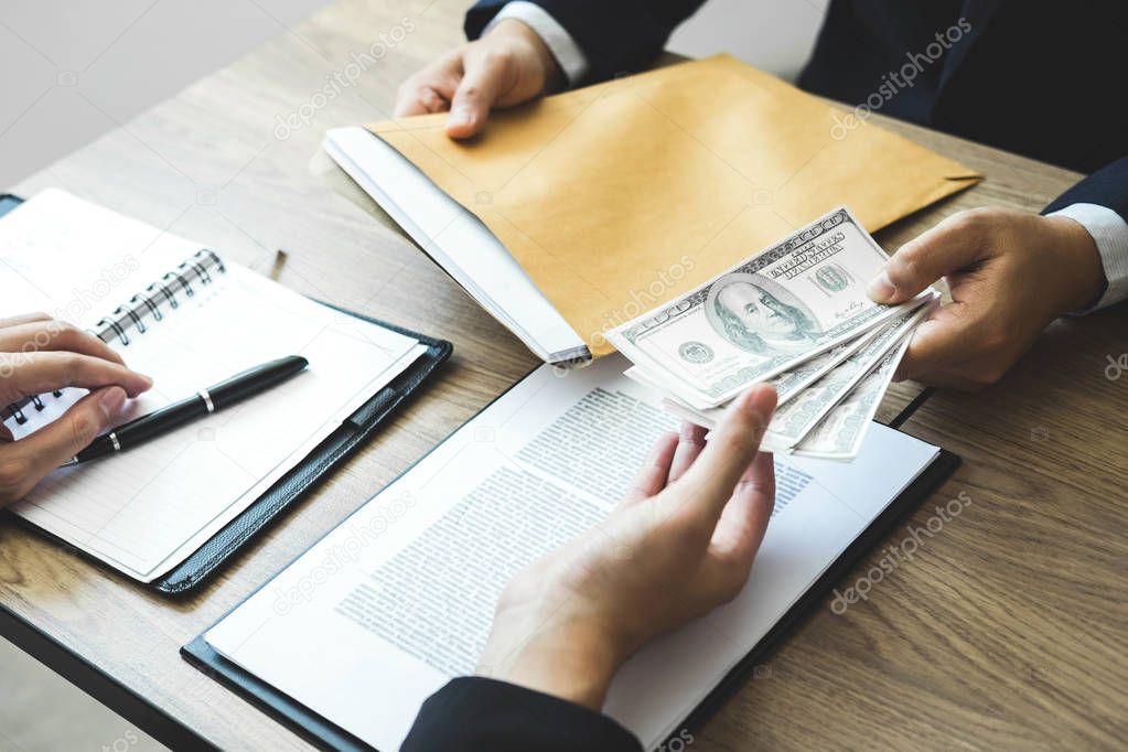 Нечестный обман в бизнесе незаконные деньги, бизнесмен дает взятку людям бизнеса, чтобы принять соглашение договора инвестиционной сделки, взяточничества и коррупции концепции .
