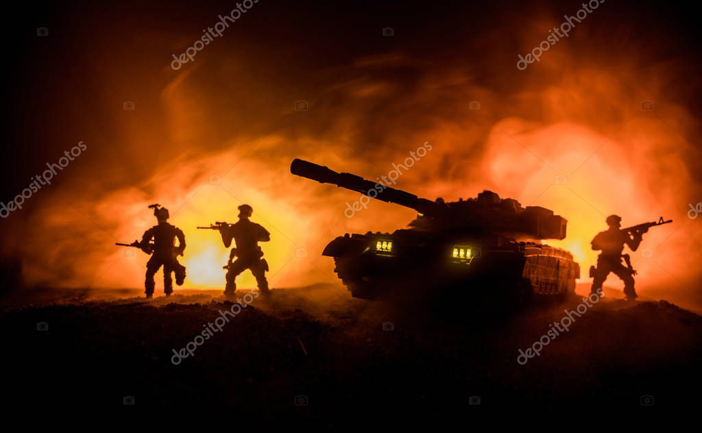 - Концепция войны. Военные силуэты боевой сцены на фоне тумана войны, силуэт бронированного автомобиля под облачным горизонтом ночью. Сцена нападения. Танковая битва. Декорации