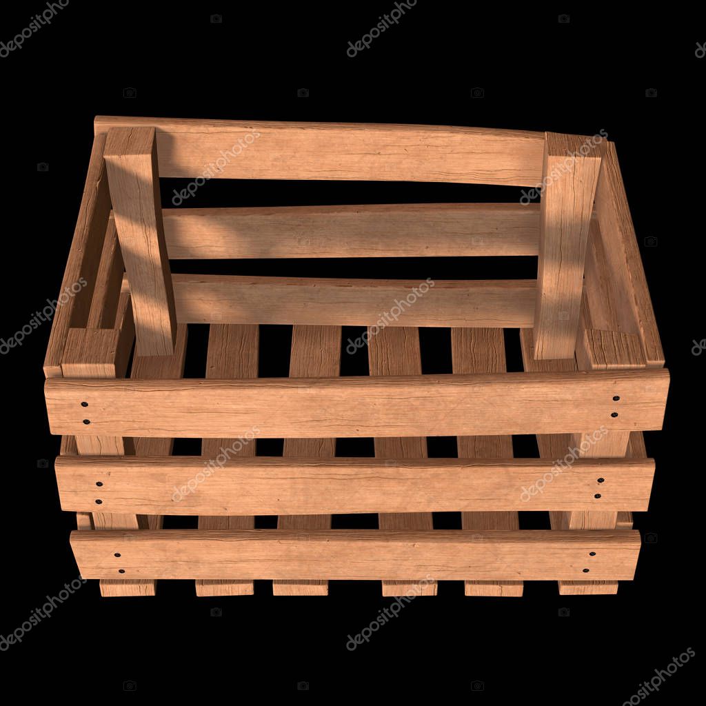 Деревянный ящик для транспортировки и хранения продукции. Пустой ящик для фруктов и овощей. 3D рендеринг на черном фоне